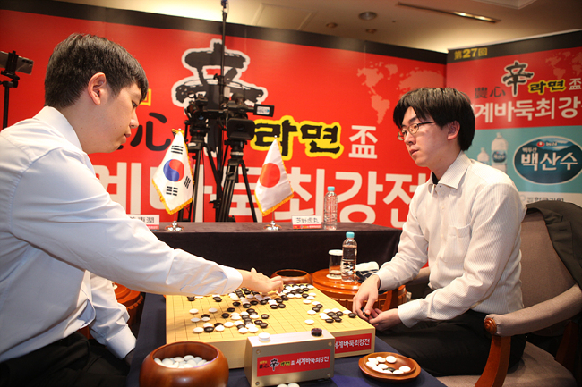 11月23日,挑战新擂主芝野虎丸。前半盘黑棋一直占据优势。加1次1分钟读秒。日本队芝野虎丸九段执黑177手中盘击败韩国队姜东润九段,